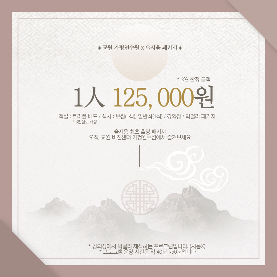싱글베드 3개(3인실) 객실 / 일반식 2식+BBQ오븐구이 / 강의장 / 프로그램(컬링 또는 오징어게임) / 이 외 프로그램 재료비 등의 사유로 원스탑패키지 단가로 진행이 어려울 수 있습니다.